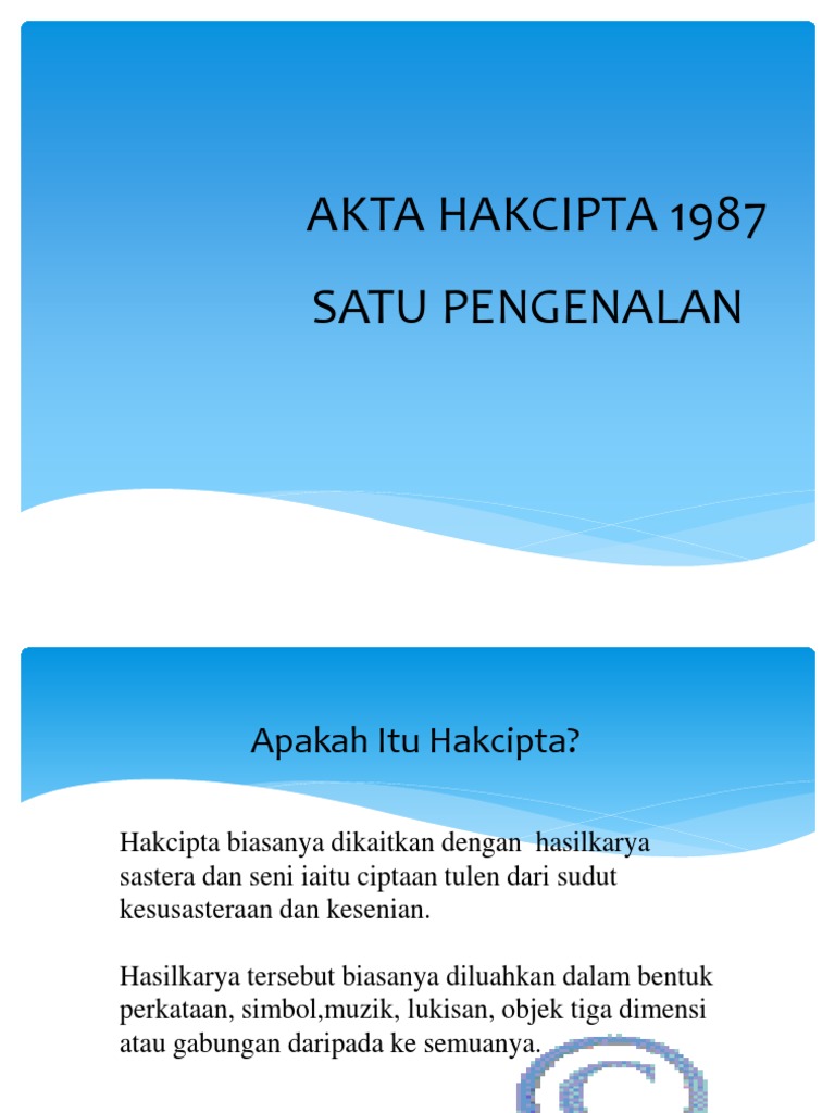 Akta hakcipta 1987 (copyright act 1987) akta pengangkutan j a l a n 1987 (road transport akta lembaga pelesenan kenderaan perdagangan 1987 (commercial vehicles licensing board act 1987) akta kewangan 1987 (finance act 1987). Paten adalah hak eksklusif yang diberikan terhadap suatu rekacipta, yang merupakan produk atau proses untuk menghasilkan cara baru untuk melakukan sesuatu, ataupun untuk penyelesaian teknikal terhadap sesuatu masalah. Akta hak cipta dalam pinjaman antara perpustakaan dan perkhidmatan sistem pembekalan penerbitan. Perlindungan hak cipta diatur di dalam uu no. Hak cipta ialah satu set hak eksklusif yang mengawal penggunaan sesuatu pernyataan idea atau maklumat.